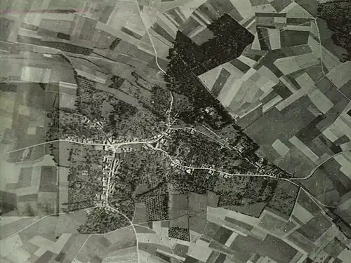 L'occupation des sols de la commune, telle qu'elle ressort de la base de données européenne d'occupation biophysique des sols Corine Land Cover (CLC), est marquée par l'importance des territoires agricoles (96,7 % en 2018), une proportion identique à celle de 1990 (96,7 %). La répartition détaillée en 2018 est la suivante : terres arables (74,3 %), prairies (12,6 %), zones agricoles hétérogènes (9,8 %), zones urbanisées (2,5 %), forêts (0,8 %)[17]. L'évolution de l'occupation des sols de la commune et de ses infrastructures peut être observée sur les différentes représentations cartographiques du territoire : la carte de Cassini (XVIIIe siècle), la carte d'état-major (1820-1866) et les cartes ou photos aériennes de l'IGN pour la période actuelle (1950 à aujourd'hui)[Carte 2].