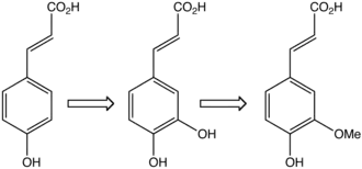 Dans les plantes, l'acide caféique (milieu) est formé par hydroxylation de l'acide paracoumarique (gauche) et transformé en acide férulique (droite).