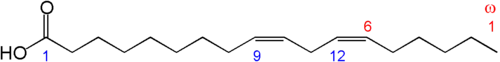 L'acide linoléique est un acide gras polyinsaturé oméga-6 correspondant à l'acide tout-cis-Δ9,12 C18:2 n-6