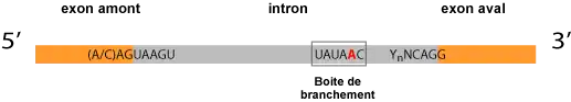 Les jonctions amont et aval de chaque intron se caractérisent par des séquences de nucléotides conservées, qui sont reconnues par la machinerie d'épissage. Il existe également une séquence conservée à l'intérieur de l'intron, appelée boîte de branchement, qui contient une adénosine strictement conservée essentielle au mécanisme.