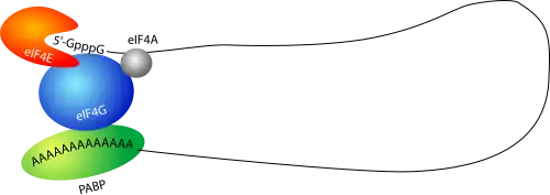 Dans le cytoplasme des cellules eucaryotes, les ARNm existent sous forme de complexes associés à des protéines, sous forme pseudo-circulaire. La coiffe en 5′ est en effet reconnue par le facteur de démarrage de la traduction eIF4E. La queue poly(A) est recouverte par une protéine spécifique, la PABP (poly(A) binding protein). Ces protéines, eIF4E et PABP interagissent toutes les deux avec une même protéine organisatrice, le facteur de démarrage eIF4G[11]. Ceci conduit à une circularisation de l'ARNm au travers de ce complexe protéique, ses deux extrémités 5′ et 3′ étant ainsi rapprochées. Ce complexe contient aussi d'autres facteurs de démarrage, comme eIF4A qui est une ARN hélicase.
