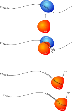 Après la coupure, CPSF va recruter la poly(A) polymérase qui va synthétiser une queue poly(A) composée de 100 à 250 résidus adényliques[6]. Cette queue poly(A) joue plusieurs rôles, via le recrutement de protéines spécifiques, les PABP (poly(A) binding proteins). La polyadénylation et la fixation des PABP sur l'ARNm sont importantes pour l'export nucléaire[7], la protection contre les ribonucléases mais aussi 3′-OH, mais surtout pour la traduction en protéine (voir plus bas).
