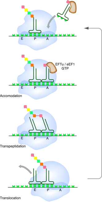 Le début du cycle de synthèse démarre avec le ribosome ayant un seul ARNt fixé au site P par l'interaction codon-anticodon. Celui-ci porte estérifié à son extrémité 3′ le début de la chaîne peptidique synthétisée. Le site A est initialement vacant. Des ARNt aminoacylés diffusent dans le ribosome de manière stochastique. Ceux-ci sont associés à un facteur d'élongation (EF-Tu chez les bactéries, eEF1 chez les eucaryotes) qui est une GTPase. Le ribosome teste si l'appariement codon-anticodon est correct. C'est la petite sous-unité du ribosome qui effectue ce contrôle au niveau du site de décodage. Si l'appariement codon-anticodon n'est pas correct, l'ARNt est rejeté et le processus d'essai-erreur se répète. Lorsqu'un ARNt correct s'apparie enfin au codon, le facteur d'élongation hydrolyse une molécule de GTP, ce qui provoque un changement de conformation du complexe ribosomique et la dissociation du facteur d'élongation. Il y a alors formation de la liaison peptidique entre l'acide aminé porté par l'ARNt au site A et celui porté par l'ARNt au site P. Cette réaction se produit au niveau du site catalytique de la grande sous-unité du ribosome et conduit au transfert de la chaîne peptidique sur l'ARNt lié au site A. Le ribosome recrute alors un facteur de translocation (EF-G chez les bactéries, eEF2 chez les eucaryotes), lui aussi lié à une molécule de GTP. Ce facteur utilise l'énergie d'hydrolyse de ce GTP pour permettre la progression du ribosome sur l'ARNm. L'ARNt nu qui était au site P se retrouve décalé au site E de sortie et l'ARNt qui était au site A vient au site P. Le site A redevient ainsi vacant. L'ARNt nu du site E diffuse en dehors du ribosome et on revient dans l'état initial pour un nouveau cycle d'élongation.