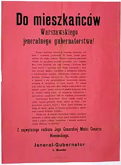 Le , à Varsovie, le gouverneur général, Hans Hartwig von Beseler, annonce solennellement, au nom de Guillaume II et de François-Joseph, le souhait des puissances centrales de permettre la renaissance d'un royaume de Pologne[8].