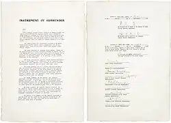 - Actes de capitulation de l'Allemagne, signés le à Reims, valable pour le seul front de l'ouest ; le , à Berlin, les représentants du Reich confirment leur reddition sur l'ensemble des théâtres d'opérations sur lesquels des unités allemandes sont engagées.
