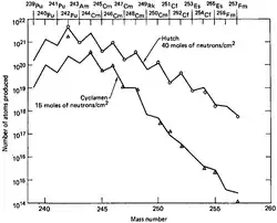 - ↑ (en) P. R. Fields, M. H. Studier, H. Diamond, J. F. Mech, M. G. Inghram, G. L. Pyle, C. M. Stevens, S. Fried, W. M. Manning, A. Ghiorso, S. G. Thompson, G. H. Higgins et G. T. Seaborg, « Transplutonium Elements in Thermonuclear Test Debris », Physical Review, vol. 102, no 1, , p. 180-182 (DOI 10.1103/PhysRev.102.180, Bibcode 1956PhRv..102..180F, lire en ligne)