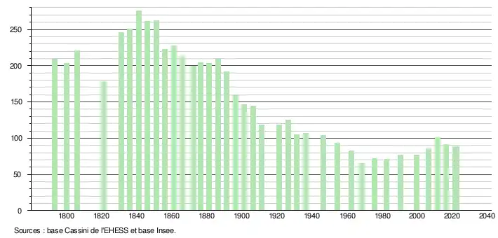 L'évolution du nombre d'habitants est connue à travers les recensements de la population effectués dans la commune depuis 1793. Pour les communes de moins de 10 000 habitants, une enquête de recensement portant sur toute la population est réalisée tous les cinq ans, les populations de référence des années intermédiaires étant quant à elles estimées par interpolation ou extrapolation[16]. Pour la commune, le premier recensement exhaustif entrant dans le cadre du nouveau dispositif a été réalisé en 2006[17].
