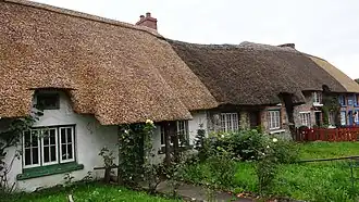 - Une série de maisons aux toits de chaume reste bien visible près de l'entrée du château.