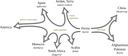L'irrigation à base de cannaux et de qarat aurait été développée pour irriguer ces plantes, en particulier en Perse, où ces canaux doublent la quantité d'eau disponible pour l'arrosage et l'agrément[9]. Ainsi, la Perse a pu profiter de plus grands excédents de produits agricoles, ce qui a augmenté l'urbanisation et la stratification sociale[10]. Ces techniques d'irrigation se sont développées l'ouest et l'est à partir de la Perse.