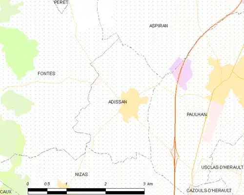 - ↑ « Orthodromie entre Adissan et Roujan », sur fr.distance.to (consulté le ).
