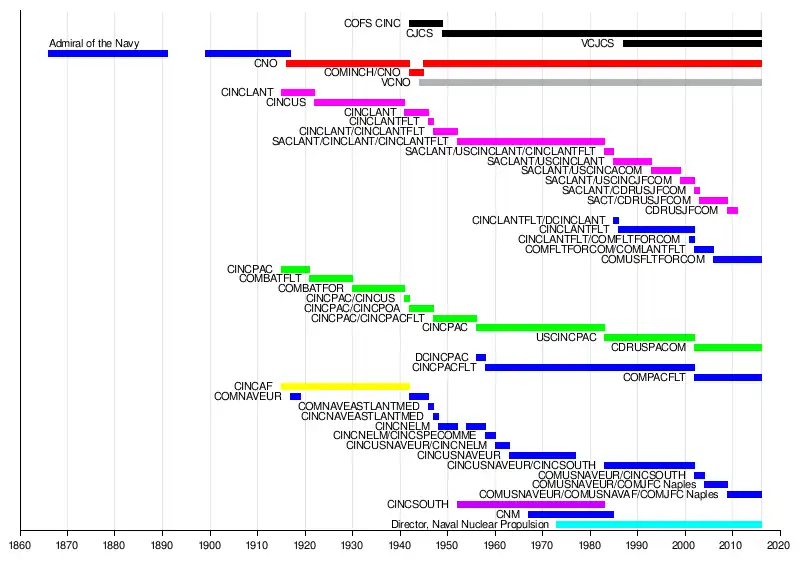 Lorsque le directeur du programme de réacteur nucléaire navale, Hyman Rickover, a finalement été contraint de prendre sa retraite en 1982, son successeur a été promu au rang d’admiral et nommé directeur de la propulsion nucléaire navale (Naval Reactors), institutionnalisant ce commandement avec un grade d’admiral (quatre étoiles) permanent. Pour compenser, un autre commandement à quatre étoiles a été éliminé par la fusion de l'Allied Forces Southern Europe avec l'U.S. Naval Forces Europe. De même, lorsque l'U.S. Atlantic Fleet (CINCLANTFLT) a été séparé de l'United States Atlantic Command en 1985, le nombre de commandements quatre étoiles a été conservée par l'élimination du poste de chief of naval material. L'U.S. Atlantic Fleet a été remplacée par l’US Fleet Forces Command (COMUSFLTFORCOM) en 2006.