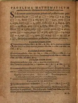 En 1595, par amitié pour le mathématicien épéiste et génial calculateur Ludolph van Ceulen, il fait publier un défi aux mathématiciens du monde entier (c'est-à-dire l'Europe)[24], où il leur propose de résoudre une équation de degré 45, posée dans un langage propre à Stevin, et voisin de la Coss.
