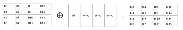 Finalement, un OU exclusif XOR entre la matrice et une autre matrice permet d'obtenir une matrice intermédiaire. Ces différentes opérations sont répétées plusieurs fois et définissent un « tour ». Pour une clé de 128, 192 ou 256, AES nécessite respectivement 10, 12 ou 14 tours.