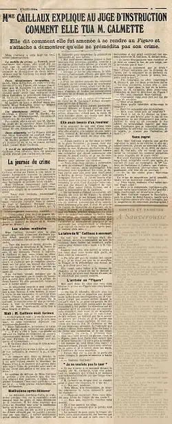 Dans l'après-midi du , Henriette Caillaux, décidée à défendre la réputation de son mari et la sienne mais épuisée nerveusement après une campagne de presse de trois mois, achète pour 55 francs chez l'armurier de la bourgeoisie Gastinne Renette un pistolet automatique Browning modèle 1906, qu'elle essaie dans un stand au sous-sol. Vers 17 h 15, elle se fait conduire dans une Limousine avec chauffeur (la voiture de ministre de son mari, dont elle a fait retirer la cocarde ministérielle) à la direction du Figaro au 26, rue Drouot pour rencontrer Calmette[10]. Portant une jaquette de karakul assortie à sa robe de satin noir et une toque à aigrette, elle a les mains enfouies dans un manchon à fourrure, ce qui est surprenant pour la saison. L'huissier lui annonce que le directeur est absent, aussi attend-elle près d'une heure dans l'antichambre. À six heures du soir, Calmette arrive avec l'écrivain Paul Bourget et accepte de la recevoir dans son bureau, par galanterie, alors qu'il n'est que de passage. Après de brèves salutations, elle annonce l'objet de sa visite, la cabale médiatique dont est victime son mari, puis retire de son manchon le pistolet et tire à bout portant sur Calmette six balles : deux se fichent dans la bibliothèque, une est arrêtée par le portefeuille de la victime, une autre érafle son thorax, mais deux autres font mouche dont une fatale qui perfore l'artère iliaque au niveau de l'intestin[11]. Les employés du journal accourent, découvrent leur directeur qui gît à terre. Henriette Caillaux, livide, déclare : « Puisqu'il n'y a pas de justice en France ». Calmette est mis dans un fauteuil en attendant les médecins et a le temps de murmurer : « J'ai fait mon devoir. Ce que j'ai fait, je l'ai fait sans haine[12]. » Henriette Caillaux se rend, sans avoir tenté de fuir. Interrogée au commissariat du faubourg Montmartre, elle reconnaît les faits, expliquant qu'elle voulait lui donner une leçon et espérant ne pas l'avoir trop gravement blessé, fait qui « d'après sa défense n'était pas souhaité »[13]. Transporté à la clinique du docteur Hartmann de Neuilly-sur-Seine, Calmette meurt sur la table d'opération après que l'équipe médicale a hésité de longues heures avant de l'opérer. Incarcérée à la prison Saint-Lazare, Henriette Caillaux est renvoyée en cour d'assises sous l'inculpation d'homicide volontaire avec préméditation[14].