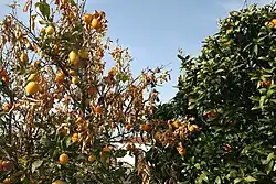 Citronnier gelé à côté d'un oranger indemneZone 9b (−4°C à −1°C) Oranges douces (C. sinensis), Grapefruit (français de France pamplemousse, C. paradisi), Pamplemoussier (C. maxima), Mandarines méditerranéennes, Tangor, Tangelo. Citron (C. limon)[44], le cédrat (C. medica) sous réserve d'être protégé du vent[45]. H . J. Webber classe le cédratier comme très peu rustique, moins rustique que la lime tropicale[17]. La résistance au froid du citronnier est plus faible que celle des orangers doux, des pamplemoussiers et des grapefruits, surtout exposé au vent (B. Tkatcheneao, 1951)[46].