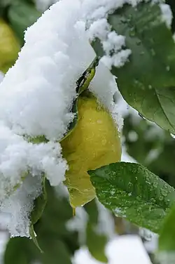 Citron sous la neige. Le citronnier n'est pas un agrume rustique, il préfère les zones littorales méditerranéennes.