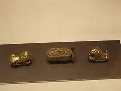 Bijoux et armes de cérémonie de la reine Iâhhotep, comprenant une hache dont la lame dépeint Ahmôsis Ier terrassant un soldat hyksôs, et des mouches d'or décernées à la reine pour son soutien contre les Hyksôs.