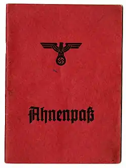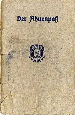 L'Ahnenpass (allemand : passeport ancestral) est un document légal d'identification qui contient une preuve de descendance officiellement certifiée. Une preuve de filiation donne la naissance, le décès ou les informations sur le mariage, dont la concordance avec les documents correspondants d'un bureau d'enregistrement, généralement les registres paroissiaux d'un bureau paroissial sont confirmées par un bureau d'état civil. L'Ahnenpass est délivré par l'Association des registraires du Reich en et est utilisé exclusivement pour le Certificat d'aryanité, il ne peut donc pas servir de substitut dans d'autres cas où des documents officiels doivent être présentés.
