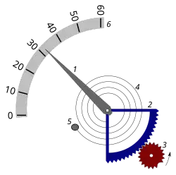 Le mécanisme d'une aiguille des minutes rétrograde est représenté par le schéma ci-contre. Dans l'exemple, l'angle décrit est de 90 degrés. L'aiguille 1 est solidaire de l'engrenage 2. L'engrenage 3, relié au mouvement d'horlogerie tourne de façon constante, une fois par heure. Sa particularité est qu'il lui manque une dent. Au cours de l'heure, l'engrenage 3 entraîne l'engrenage 2, et l'aiguille avance de la graduation « 0 » à la graduation « 60» de l'échelle 6. Le ressort spiral 4, fixé en 5 à la platine, est donc de plus en plus déformé. Lorsque l'aiguille est arrivée à la position 60, l'engrenage 3 libère l'ensemble 1-2, du fait de la dent manquante. Sous l'impulsion du ressort qui se détend, l'aiguille retourne donc en 0 (une butée arrête le mouvement) et le cycle recommence[1].