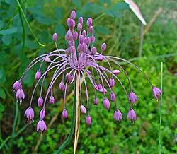 Inflorescence en ombelle très lâche. Spathe à deux valves très longues et pointues. Fleurs pourpres, en forme de petites coupes d'environ 5 mm. Les fleurs, à longs pédicelles grêles, sont assez rares, remplacées par de nombreux bulbilles qui assurent l'essentiel de la reproduction de la plante. Étamines à anthères pourpres, dépassant l'extrémité de la corolle.