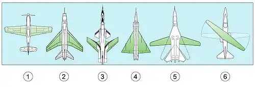 - Les ailes à géométrie variable sont capables de modifier la flèche en vol pour tirer profit des avantages offerts par les ailes droites et les ailes en delta. Proposées par des aérodynamiciens allemands pendant les années 1940, elles n'ont été utilisées qu'à partir des années 1970 sur des avions comme le F-14 Tomcat, le F-111, le Tornado, le Su-17/20/22 et le MIG-23. Une configuration expérimentale (non poursuivie) est celle de l’aile oblique (X-plane, à ne pas confondre avec le X-Wing), qui peut pivoter autour d'un point de fixation situé sur le fuselage et présenter ainsi une flèche positive d'un côté et négative de l'autre. Pour explorer ce concept, la NASA Ames a fait voler un prototype AD-1 construit par Burt Rutan entre 1979 et 1982.