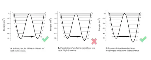 En effet, comme il est possible de le voir sur la figure n° 6, montrant le schéma de l'énergie potentielle d'un aimant moléculaire pour un champ magnétique passant de à , où n est un nombre entier compris entre 1 et 10, l'effet tunnel de l'aimantation n'est présent que lorsque les états sont en résonance, c'est-à-dire lorsque les niveaux d'énergie de chacun des puits sont alignés.