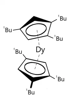 Le dysprosocenium, de formule où (1,2,4-tri(tert-butyle)cyclopentadiène) et (tert-Butyle) conserve en le record, avec une température d'hystérésis de 60 kelvins[14],[15].