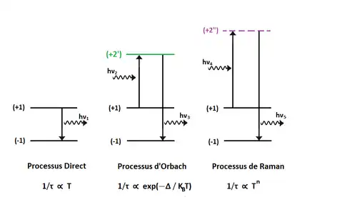À des températures plus élevées, le couplage de l'aimantation magnétique aux phonons devenant plus important, d'autres mécanismes de relaxation prennent place. Ces différents processus sont visibles dans la figure n°7, où et sont les deux composantes de la séparation Zeeman, et et symbolisent un état excité réel et virtuel, respectivement. Dans le processus dit direct, la relaxation de l'aimantation de à se fait via l'émission d'un seul phonon d'énergie , où et sont les énergies respectives des états et . Comme peu de phonons correspondent à cette condition, ce processus n'est pas très efficace dans les SIMs. À l'inverse, les processus d'Orbach et de Raman représentées dans la figure 7 sont bien plus performants car ils impliquent des phonons de plus grande énergie. Dans les deux cas, la différence d'énergie entre le phonon absorbé et celui émis est égale à la séparation Zeeman de l'état fondamental : . Les deux processus diffèrent dans les énergies des phonons, et donc dans la nature de l'état excité impliqué dans la relaxation. Alors que dans le cas du processus d'Orbach l'énergie du phonon correspond à l'énergie d'une séparation entre deux états réels, le processus de Raman se fait par absorption et réémission d'un phonon virtuel. On différencie ces processus en caractérisant la relaxation de l'aimantation comme une fonction de la température[12].