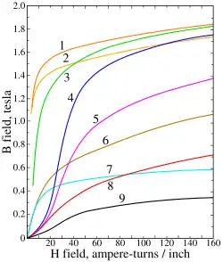 Différents matériaux ont des niveaux de saturation différents. Par exemple, les alliages de fer à haute perméabilité utilisés dans les transformateurs atteignent la saturation magnétique à 1,6-2,2 teslas (T)[4], tandis que les ferrites saturent à 0,2-0,5 T[5]. Certains alliages amorphes saturent à 1,2-1,3 T[6]. Le mu-métal sature à environ 0,8 T[7],[8].