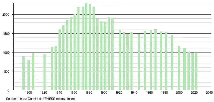 L'évolution du nombre d'habitants est connue à travers les recensements de la population effectués dans la commune depuis 1793. Pour les communes de moins de 10 000 habitants, une enquête de recensement portant sur toute la population est réalisée tous les cinq ans, les populations de référence des années intermédiaires étant quant à elles estimées par interpolation ou extrapolation[24]. Pour la commune, le premier recensement exhaustif entrant dans le cadre du nouveau dispositif a été réalisé en 2007[25].