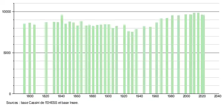 - ↑ Fiches Insee - Populations de référence de la commune pour les années 2006, 2007, 2008, 2009, 2010, 2011, 2012, 2013, 2014, 2015, 2016, 2017, 2018, 2019, 2020, 2021 et 2022.