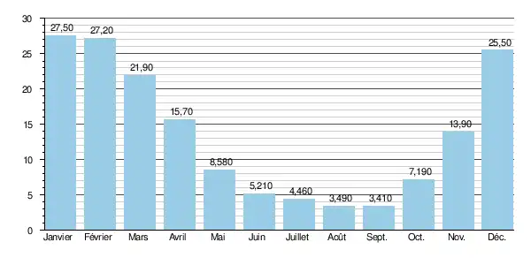 Le QIX 10 est de 160 m3/s, le QIX 20 de 180 m3/s et le QIX 50 de 210 m3/s. Les QIX 2 et QIX 5 valent quant à eux respectivement 100 et 140 m3/s. D'où il ressort que la crue de dont il a été question plus haut, était plus que cinquantennale, peut-être centennale, et dans tous les cas exceptionnelle.