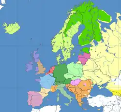 - en Europe occidentale entre l'Europe latine, où l'héritage de l'empire romain est resté dominant, et l'Europe germanique, où il a été fortement syncrétisé avec la culture germanique