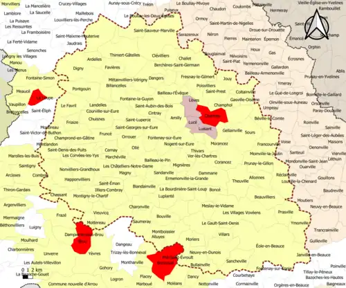 Communes de la couronne Eure-et-Loir 112 Allonnes , Alluyes , Amilly , Ardelles , Bailleau-le-Pin , Bailleau-l'Évêque , Barjouville , Beauvilliers , Berchères-Saint-Germain , Berchères-les-Pierres , Billancelles , Blandainville , Boisville-la-Saint-Père , La Bourdinière-Saint-Loup , Boncé , Bouville , Briconville , Bullainville , Cernay , Challet , Champhol , Champrond-en-Gâtine , Charonville , Chassant , Châteauneuf-en-Thymerais , Les Châtelliers-Notre-Dame , Chauffours , Chuisnes , Cintray , Clévilliers , Coltainville , Combres , Corancez , Les Corvées-les-Yys , Courville-sur-Eure , Dammarie , Dangers , Digny , Épeautrolles , Ermenonville-la-Grande , Ermenonville-la-Petite , Favières , Le Favril , Fontaine-la-Guyon , Fontenay-sur-Eure , Francourville , Fresnay-le-Comte , Fresnay-le-Gilmert , Friaize , Fruncé , Gasville-Oisème , Le Gault-Saint-Denis , Gellainville , Happonvilliers , Houville-la-Branche , Illiers-Combray , Jouy , Landelles , Lèves , Luplanté , Magny , Marchéville , Méréglise , Meslay-le-Grenet , Meslay-le-Vidame , Mignières , Mittainvilliers-Vérigny , Montboissier , Montigny-le-Chartif , Morancez , Moriers , Mottereau , Neuvy-en-Dunois , Nogent-le-Phaye , Nogent-sur-Eure , Nonvilliers-Grandhoux , Ollé , Orrouer , Poisvilliers , Pontgouin , Prasville , Pré-Saint-Évroult , Pré-Saint-Martin , Prunay-le-Gillon , Saint-Arnoult-des-Bois , Saint-Aubin-des-Bois , Saint-Avit-les-Guespières , Saint-Denis-des-Puits , Saint-Éman , Saint-Georges-sur-Eure , Saint-Germain-le-Gaillard , Saint-Luperce , Saint-Maixme-Hauterive , Saint-Prest , Saint-Sauveur-Marville , Sancheville , Sandarville , Saumeray , Sours , Theuville , Le Thieulin , Thimert-Gâtelles , Thivars , Tremblay-les-Villages , Ver-lès-Chartres , Éole-en-Beauce , Vieuvicq , Villars , Villebon , Vitray-en-Beauce , Les Villages Vovéens , Ymonville .