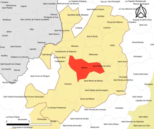 L’aire de Ribérac est une aire intra-départementale qui comporte 24 communes, entièrement situées dans le département de la Dordogne[3].