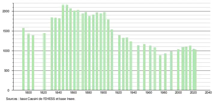 L'évolution du nombre d'habitants est connue à travers les recensements de la population effectués dans la commune depuis 1793. Pour les communes de moins de 10 000 habitants, une enquête de recensement portant sur toute la population est réalisée tous les cinq ans, les populations de référence des années intermédiaires étant quant à elles estimées par interpolation ou extrapolation[35]. Pour la commune, le premier recensement exhaustif entrant dans le cadre du nouveau dispositif a été réalisé en 2005[36].