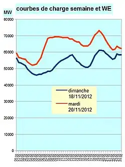 Les graphiques ci-dessous donnent des exemples réels de placement sur courbe de charge, un mardi et un dimanche ; le choix s'est porté sur des jours froids (hiver), de façon à faire apparaître tous les moyens de production ; sur un jour plus moyen, il serait beaucoup moins fait appel aux centrales à charbon, au fioul et à gaz, surtout le dimanche. La production totale ne couvre pas seulement la consommation finale française, mais aussi les exportations et le pompage (figurés par des hachures et des quadrillages) ; le pompage, limité aux heures creuses en semaine, s'étend à la plus grande partie de la journée le dimanche.