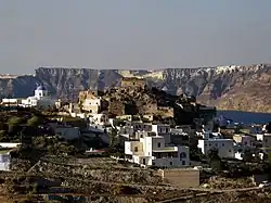 La rareté des traces archéologiques trouvées pour les époques postérieures suggère qu'il a fallu plusieurs siècles avant que la végétation se soit suffisamment développée pour permettre une réoccupation par des hommes. Des tessons isolés de la phase SH IIIB de la civilisation mycénienne, vers 1200 av. J.-C. ont été trouvés près de Monolithos[28]. Hérodote rapporte une colonie phénicienne, mais qui ne peut pas être démontrée ensuite. Selon Hérodote et Pausanias, ce n'est qu'au IXe siècle av. J.-C. que les Doriens établirent un peuplement significatif, dont le chef Théras (Θήρας) donna à l'île le nom qu'elle porte jusqu'à maintenant : « Théra ». Ils ne s'installèrent pas sur le site d'Akrotiri, mais bâtirent leur ville, Théra, sur un promontoire rocheux du mont Messavouno au-dessus du bourg actuel de Kamari.
