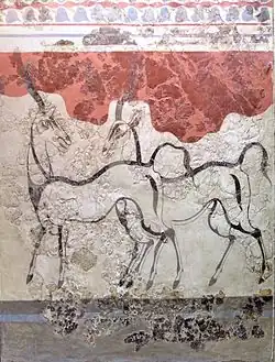 Une caractéristique du haut niveau de vie des habitants d'Akrotiri est le grand nombre de fresques[n 4]. Les thèmes vont de motifs géométriques à des jeux sportifs ou cultuels, en passant par des scènes de la vie de tous les jours, des marines et des paysages. Les paysages figurent le monde animal et végétal de Santorin et de pays exotiques comme l'Égypte. On a des preuves de l'utilisation de couleurs à des fins décoratives en Crète depuis le Néolithique, l'utilisation de pigments purifiés et de motifs abstraits y commence avec le protopalatial. Les représentations figuratives sont attestées en Crète depuis le néopalatial[29].