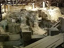 Au bout de quarante ans de fouilles continues, on n'a dégagé qu'à peine deux hectares de la ville, qui occupait une surface bien plus grande. Il s'agit largement d'un instantané de la localité au moment de sa destruction, au milieu du IIe millénaire av. J.-C., la datation précise étant encore en discussion. Les couches stratigraphiques plus anciennes n'ont été explorées que ponctuellement, dans des tranchées faites pour extraire les poteaux de soutènement des toits. On y a trouvé des tessons de poterie et d'autres artéfacts depuis le Néolithique en passant par les diverses périodes de la civilisation des Cyclades[8].