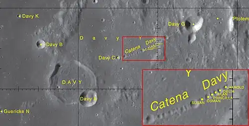 Cratères le long de la catena Davy, image prise par Luna Orbiter en 1967. | ||