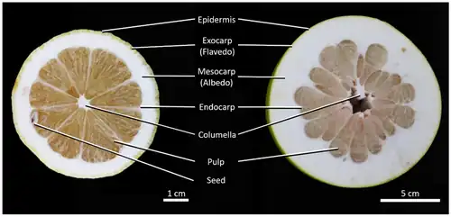 «La structure de la peau du citron et du pamplemousse est relativement similaire, elle peut servir d'inspiration pour la conception de structures techniques en sandwich» (M. Jentzsch et al. 2022)[1]. L'albedo est considéré comme une couche intermédiaire (transition plus ou moins graduée selon les agrumes) entre le flavédo d'épaisseur millimétrique et à forte densité cellulaire et la pulpe. Sa densité et son épaisseur varient et changent pendant la maturation du fruit. L'albédo joue un rôle de mousse isolante. Ainsi il devient moins dense à mesure que le fruit grossit et d'autant plus capable d'amortir la chute du fruit[1] et a une forte capacité de rétention d'eau[7]. Les couches cellulaires de l'albédo sont considérées comme du tissu mésocarpien, et les deux ou trois couches cellulaires les plus internes sont appelées endocarpe[6].