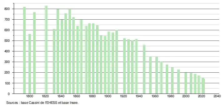 L'évolution du nombre d'habitants est connue à travers les recensements de la population effectués dans la commune depuis 1793. Pour les communes de moins de 10 000 habitants, une enquête de recensement portant sur toute la population est réalisée tous les cinq ans, les populations de référence des années intermédiaires étant quant à elles estimées par interpolation ou extrapolation[33]. Pour la commune, le premier recensement exhaustif entrant dans le cadre du nouveau dispositif a été réalisé en 2006[34].