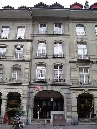 En juin 1902, Albert trouve, grâce à Marcel Grossmann[16], un emploi à l’Office des Brevets[N 7] de Berne[17], ce qui lui permet de vivre correctement tout en poursuivant ses travaux. Il emménage entre 1903 et 1905 dans l'actuelle maison d'Einstein, 49 Kramgasse. Durant cette période, il fonde l’Académie Olympia avec Conrad Habicht et Maurice Solovine, qui traduira plus tard ses œuvres en français. Ce cercle de discussion se réunit à la maison d'Einstein, et organise des balades en montagne. Einstein partage le résultat de ses travaux avec Conrad Habicht et lui envoie les articles qu’il publie pendant l’année 1905 (souvent appelée son annus mirabilis) concernant les fondements de la relativité restreinte, l’hypothèse des quanta de lumière et la théorie du mouvement brownien, qui ouvrent de nouvelles voies dans la recherche en physique nucléaire, mécanique céleste, etc. L’article portant sur le mouvement brownien prend appui sur des travaux qu’Einstein développe plus tard, et qui aboutissent à sa thèse, intitulée Eine neue Bestimmung der Moleküldimensionen Une nouvelle détermination des dimensions moléculaires », en allemand), et à son diplôme de doctorat le [11].