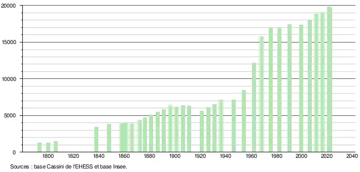 - ↑ Par convention dans Wikipédia, le principe a été retenu de n’afficher dans le tableau des recensements et le graphique, pour les populations de référence postérieures à 1999, que les populations correspondant à une enquête exhaustive de recensement pour les communes de moins de 10 000 habitants, et que les populations des années 2006, 2011, 2016, etc. pour les communes de plus de 10 000 habitants, ainsi que la dernière population de référence publiée par l’Insee pour l'ensemble des communes.