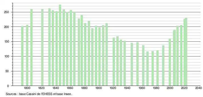 L'évolution du nombre d'habitants est connue à travers les recensements de la population effectués dans la commune depuis 1793. Pour les communes de moins de 10 000 habitants, une enquête de recensement portant sur toute la population est réalisée tous les cinq ans, les populations de référence des années intermédiaires étant quant à elles estimées par interpolation ou extrapolation[24]. Pour la commune, le premier recensement exhaustif entrant dans le cadre du nouveau dispositif a été réalisé en 2005[25].