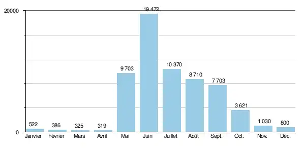 En ce qui concerne la période estivale, la seule vraiment importante car libre de glaces (de juin à septembre inclus), le débit mensuel minimal observé a été de 2 940 m3/s en , niveau restant plus que confortable voire abondant. Un débit mensuel estival inférieur à 3 000 m3/s est exceptionnel.