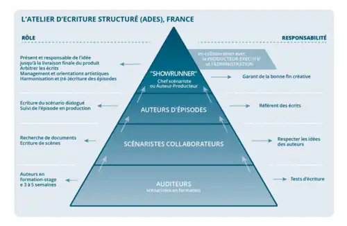 Ensemble, Alex Berger et Éric Rochant développent ainsi un processus créatif centré sur l’écriture appelé l’atelier d'écriture structurée (ADES), inspiré de la writers' room américaine. Cette organisation, orchestrée par le show runner, permet de régir les relations entre toutes les personnes intervenant dans l'écriture : les auteurs d’épisode, les scénaristes collaborateurs, et les auditeurs en formation[20],[21].