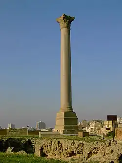 Après sa défaite par Jules César dans la guerre civile, Pompée se sauve en Égypte où il est assassiné en -48 ; les voyageurs médiévaux ont cru plus tard qu'il devait être enterré ici. En réalité, il s’agit d’une colonne en granit rouge d’Assouan de vingt-cinq mètres de haut, d’une circonférence de neuf mètres, construite en l'honneur de l'empereur Dioclétien à la fin du IVe siècle. Diocletius a capturé Alexandrie après l’avoir assiégée.