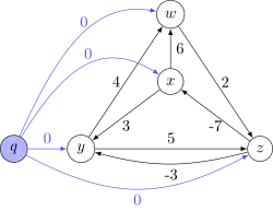 - Ajouter un nouveau sommet q au graphe, et connecter ce sommet par des arcs de poids nul à tous les autres nœuds.
